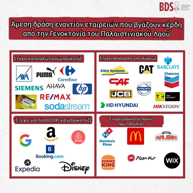 Η Παλαιστινιακή Εθνική Επιτροπή BDS (BNC), ο μεγαλύτερος συνασπισμός στην παλαιστινιακή κοινωνία που ηγείται του παγκόσμιου κινήματος Boycott, Divestment and Sanctions (BDS), χαιρετίζει ακτιβιστές, οργανώσεις και θεσμούς σε όλο τον κόσμο που έχουν εκφράσει ουσιαστική αλληλεγγύη στον επιτακτικό αγώνα μας για να σταματήσει η εκτυλισσόμενη γενοκτονία στη Γάζα από το Ισραήλ μέσω κλιμάκωσης των εκστρατειών για μποϊκοτάζ και απόσυρση επενδύσεων. Τα μποϊκοτάζ εναντίον Ισραηλινών πολυεθνικών εταιρειών και εταιρειών που συνεργάζονται με το Ισραήλ διαρκώς επεκτείνονται και μπορούν να είναι αποτελεσματικά, εάν υλοποιούνται στρατηγικά.