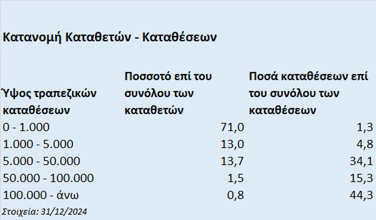 Αναλυτικότερα, σύμφωνα με την έκθεση του ΤΕΚΕ για το 2024, το 71% των καταθετών στις ελληνικές τράπεζες έχει καταθέσεις έως 1.000 ευρώ!