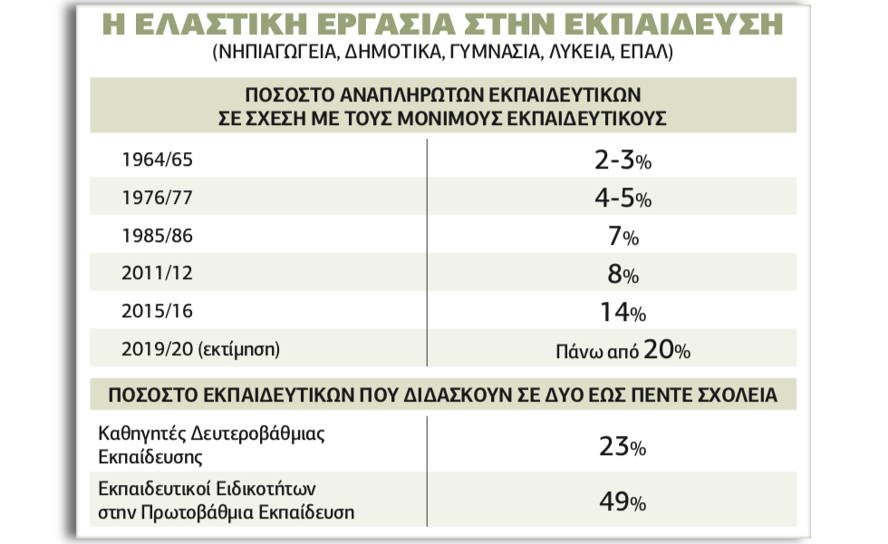 Το σχολικό έτος 2011-2012 το ποσοστό των αναπληρωτών και ωρομίσθιων εκπαιδευτικών επί των μόνιμων εκπαιδευτικών ήταν 8%, για να φτάσουμε το 2015-2016 στο 14% ενώ για τη νέα σχολική χρονιά αναμένεται ποσοστό πάνω από 20%!